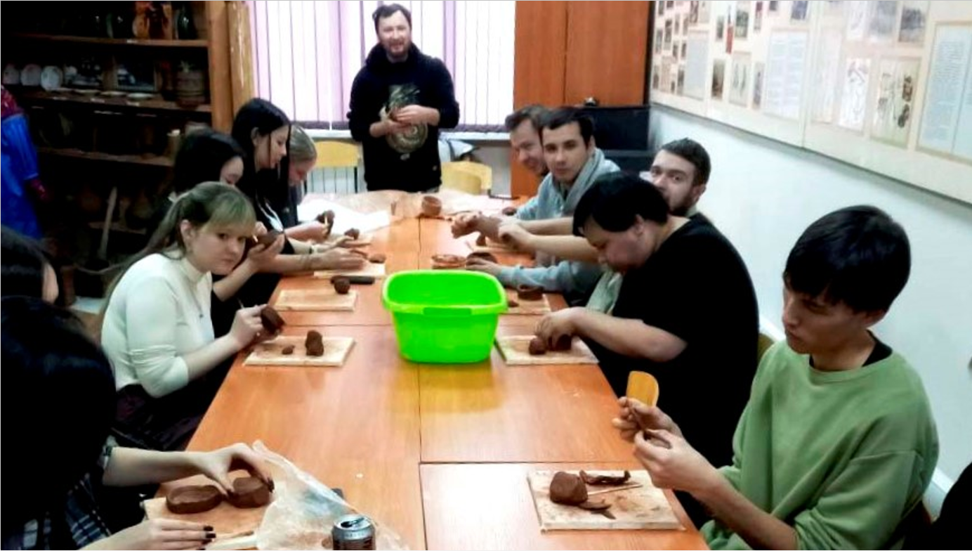 Студенты-историки, члены Студенческого археолого-этнографического кружка, продемонстрировали умение лепить простые горшки из глины. В качестве консультанта мастер-класса был приглашен Владимир Агеев – главный художник Хакасского национального краеведческого музея им. Л.Р. Кызласова.